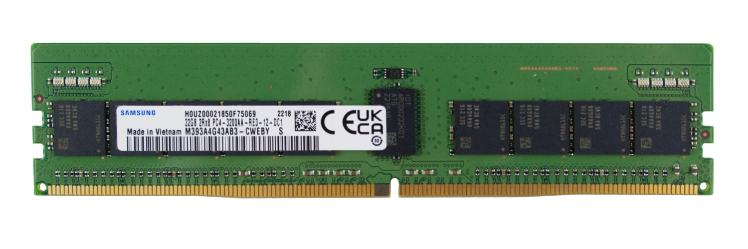 - Sestava pamětí RAM 32 GB která je složena z 1x 32GB 2Rx8 PC4-25600 DDR4 3200MHz 1.2 V ECC REGISTERED | M393A4G43AB3-CWE