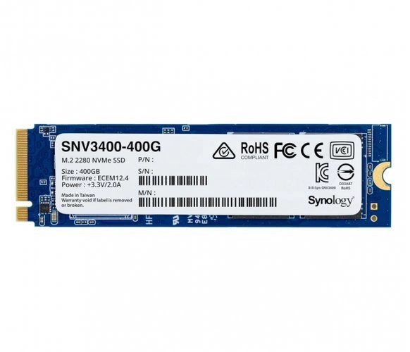 - Disk SSD s kapacitou 400GB který používá rozhraní NVMe. Disk třídy enterprise ve formátu M.2 2280 SNV3400-400G určený pro servery značky Synology