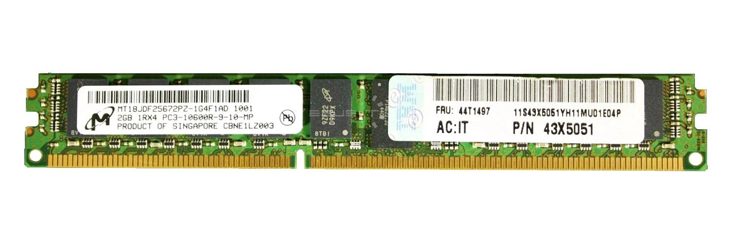 - Sestava pamětí RAM 2 GB určených pro IBM ThinkServer & System X která je složena z 1x 2GB PC3-10600 DDR3 1333MHz ECC REGISTERED DIMM | 43X5051. ESUS IT vám poskytuje záruku, že nabízený výrobek je originální.